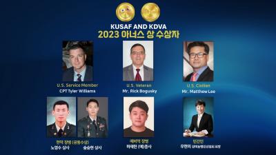 한미동맹재단(KUSAF)과 주한미군전우회(KDVA)는 한미동맹에 기여하고 동맹의 미래를 위해 특별히 헌신한 자를 선발하여 시상합니다. *더보기를 클릭하시면 수상자 개인별 자세한 이력/공적 확인이 가능합니다. <한측 수상자> 수상 분야: 대한민국 현역 성명: 상사 노영수 더보기 수상 분야: 대한민국 현역 성명: 상사 송승현 더보기 수상 분야: 대한민국 예비역 성명: 중사 (예) 하재헌 더보기 수상 분야: 대한민국 민간인 성명: 우현의 더보기 <미측 수상자> 수상 분야: 미군 현역 성명: 대위 타일러 윌리엄스 더보기 수상 분야: 미군 예비역 성명: 리챠드 보구스키 더보기 수상 분야: 미국 민간인 성명: 매튜 리 더보기