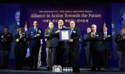 올해 한미동맹 행사에는 처음으로 주한미군 복무장병과 주한미군전우회가 주인공으로 등장했다. 주한미군전우회 회장 커티스 스카파로티 전 연합사령관은 350만 주한미군 복무장병을 대표하여 미측 대표로 답사를 하였다. 스카파로티 회장은 찰스 브라운 미 공군참모총장, 리사 프란케티 미 해군 참모차장, 존 틸렐리 전 연합사령관, 폴 라캐머라 연합사령관, 보니파스 대위 유가족, 스티븐스 전 대사 등과 함께 무대 위에 올라 윤석열 대통령께 감사와 공고한 한미동맹의 의미를 담은 액자를 선물했다. 스카파로티 회장은 대체 불가한 한미동맹은 한미 양국 국민들의 가슴속에 깊이 뿌리내리고 있다고 강조하면서 350만 주한미군 장병을 대표하여 한국 정부 및 윤석열 대통령, 한미동맹재단에 감사를 표명했다. 특별히 북한의 위협에 대응하여 대한민국 안보를 굳건하게 지켜 냄으로써 한미 양국 국민들이 안정과 번영을 이룩할 수 있도록 리더십을 보여준 윤석열 대통령께 감사를 드렸다. 재단은 태극무공훈장을 수상한 랄프 퍼켓 대령, 발도메로 로페즈 중위, 로버트 윌리엄스 대령에게 한국어 및 영어로 된 공적서 액자와 함께 재단에서 지난해 번역 발간한 “146명의 영웅들” 책자를 증정하였다. 이번 태극무공훈장 추서는 미 한국전 명예훈장 수훈자 공적서를 번역 발간한 재단의 건의로 이뤄졌다. 재단은 내년에도 미 명예훈장 수훈자 가운데 2-3명을 선정하여 국가보훈처에 태극 무공훈장을 건의할 예정이다.