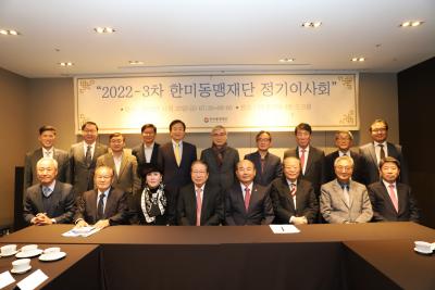 재단은 11.25일 서울 플라자 호텔에서 2022년 제3차 정기이사회를 개최했다. 유명환 이사장은 재단이 올해 달성한 성과를 언급하면서, 제1회 윌리엄 웨버 대령 한미동맹상 제정 및 시행,『146명의 영웅들』 책자 발간 등은 한미동맹 강화에 크게 기여했다고 평가했다. 이사회는 2023년 사업계획을 보고받고 소요예산 12억여 원을 승인했다. 이사회 보고 간 재단이 지원하고 있는 주한미군전우회의 2022년 사업성과 및 2023년 계획보고도 함께 이뤄졌다. 회의에 참여한 이사들은 동맹 70주년을 맞아 계획된 사업을 충실히 수행하면서 한미동맹을 더욱 증진시켜 나가자고 다짐했다.